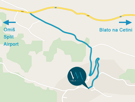 S autoputa A1 (Zagreb-Split-Dubrovnik) izadjite na izlazu Blato na Cetini. Nakon naplatnih kućica skrenite lijevo u smjeru Omiša. Vozite 6 km do sela Zvečanje. U Zvečanju, kod velikog spomenika, skrenite lijevo. Nastavite nizbrdicom do kraja i skrenite desno. Pratite cestu u blagom usponu (ne skretati u smjeru velikog uspona) dok ne prođete 2 veća zavoja i proširenje. Nastavite ravno 100 m. Vila Mosor je nadesno. |